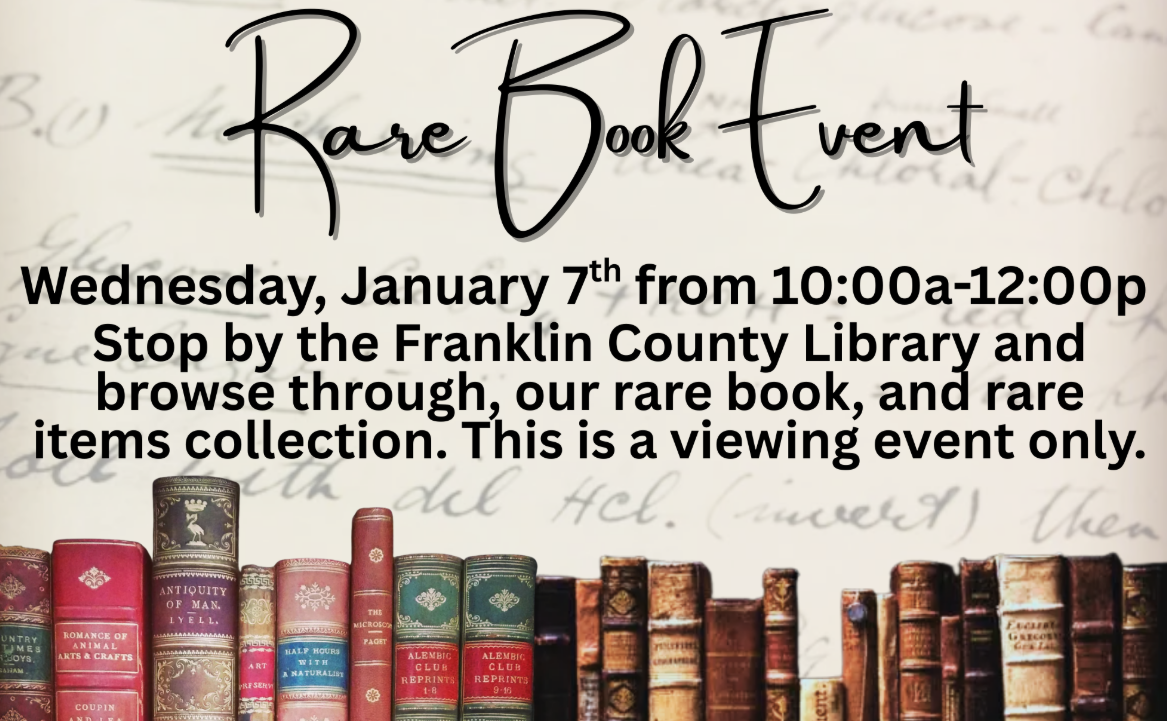 Stop by the Franklin County Library and take a look at our rare book collection, these books have been in our rare bookcase for years and will be displayed for viewing from 10a-12p in Community Room #2, gloves will be available for use while viewing.