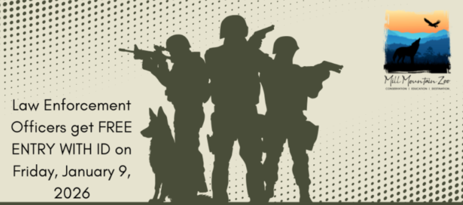 Law Enforcement Appreciation Day at Mill Mountain Zoo We’re proud to say thank you to the men and women who serve our community. In honor of Law Enforcement Appreciation Day, all law enforcement officers are invited to enjoy free Zoo admission with a valid ID. We appreciate your dedication, service, and commitment to keeping our community safe. We hope you’ll take some time to relax, explore the Zoo, and enjoy a day on the mountain with us. Thank you for all that you do—we look forward to welcoming you! #LawEnforcementAppreciationDay #ThankYouOfficers #MillMountainZoo #MMZoo