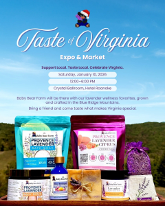Join us at the Taste of Virginia Expo & Market on Saturday, January 10, 12–6 PM at the Crystal Ballroom, Hotel Roanoke, 110 Shenandoah Ave NE, Roanoke, VA 24016Sample and shop delicious local foods, handmade goods, and artisan creations. Support sustainable Virginia farms and discover unique treats from your favorite local vendors — including Baby Bear Farm’s lavender wellness treasures!� Free & open to the public — all are welcome!