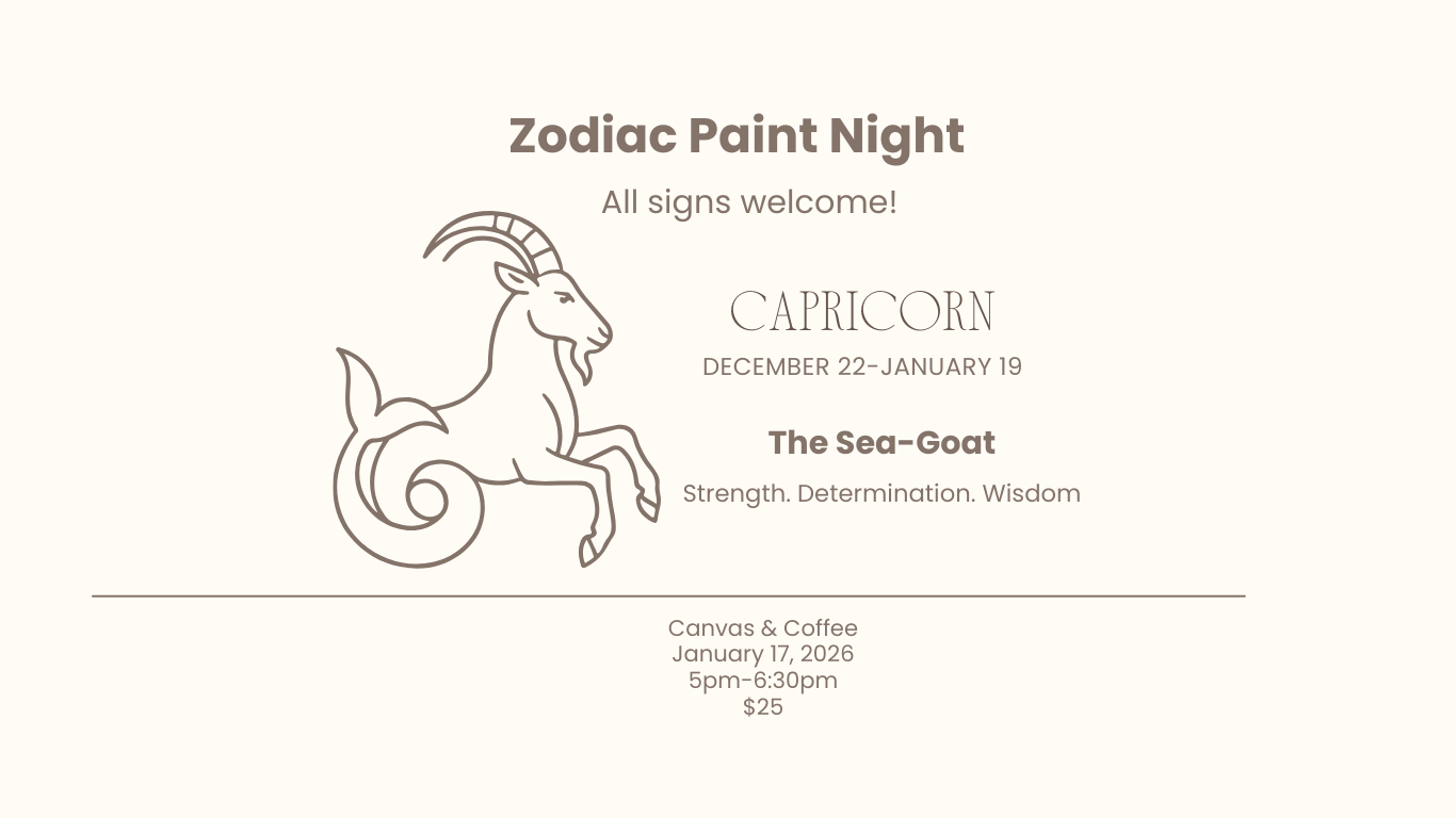 Zodiac Paint Night - Capricorn January 17, 2026 | 5pm-6:30pm | $25 Calling all Capricorns and zodiac lovers of every sign! Join us for our first Zodiac Paint Night, where we’ll be painting the Capricorn Sea-Goat (pre-sketched), the magical symbol of mountain strength and the depths and wisdom of the ocean! Whether you’re a Capricorn or just love astrology, come create, sip, and connect in a cozy, creative space. This will be a monthly series, featuring a new zodiac sign each month, collect them all or join us for your sign!