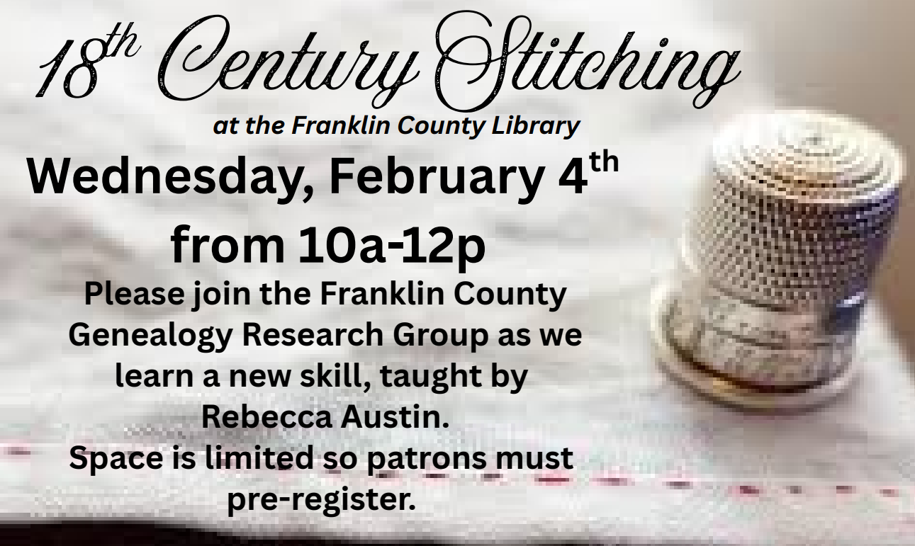 Please join the Franklin County Genealogy Research Group during this special event, 18th Century Stitching, as we learn a new skill, taught by Rebecca Austin. Space is limited so patrons much pre-register by calling 540-483-3098.