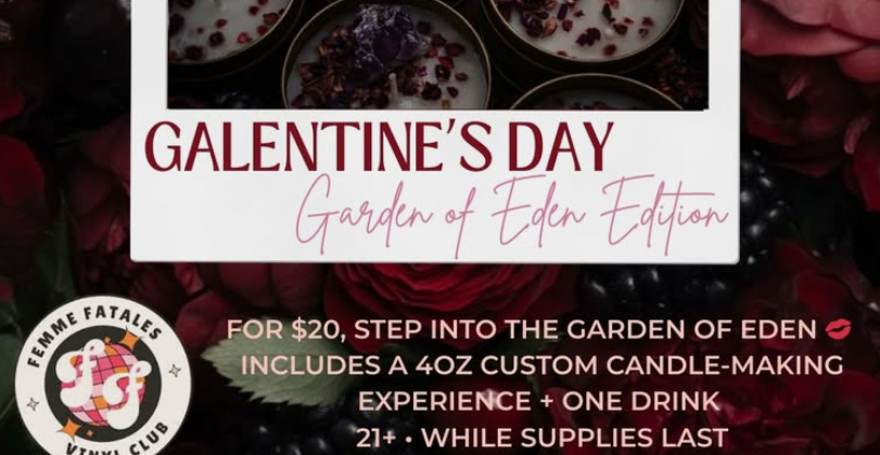 Galentine’s is back… and she’s grown, moody, and Garden of Eden-coded Join us for Galentine’s Day: Garden of Eden Edition — a night of candles, cocktails, and unapologetic feminine energy. For $20, you’ll create your own 4oz custom candle from start to finish: choose your signature scent blend, then top it off with dried flowers + crystals to make it as soft, bold, or chaotic-good as you want.Plus, your ticket includes one drink, and Femme Fatales Vinyl Club will be spinning vinyl all night long to keep the vibes immaculate.21+ • while supplies lastCome with your besties. Leave with your new favorite candle.