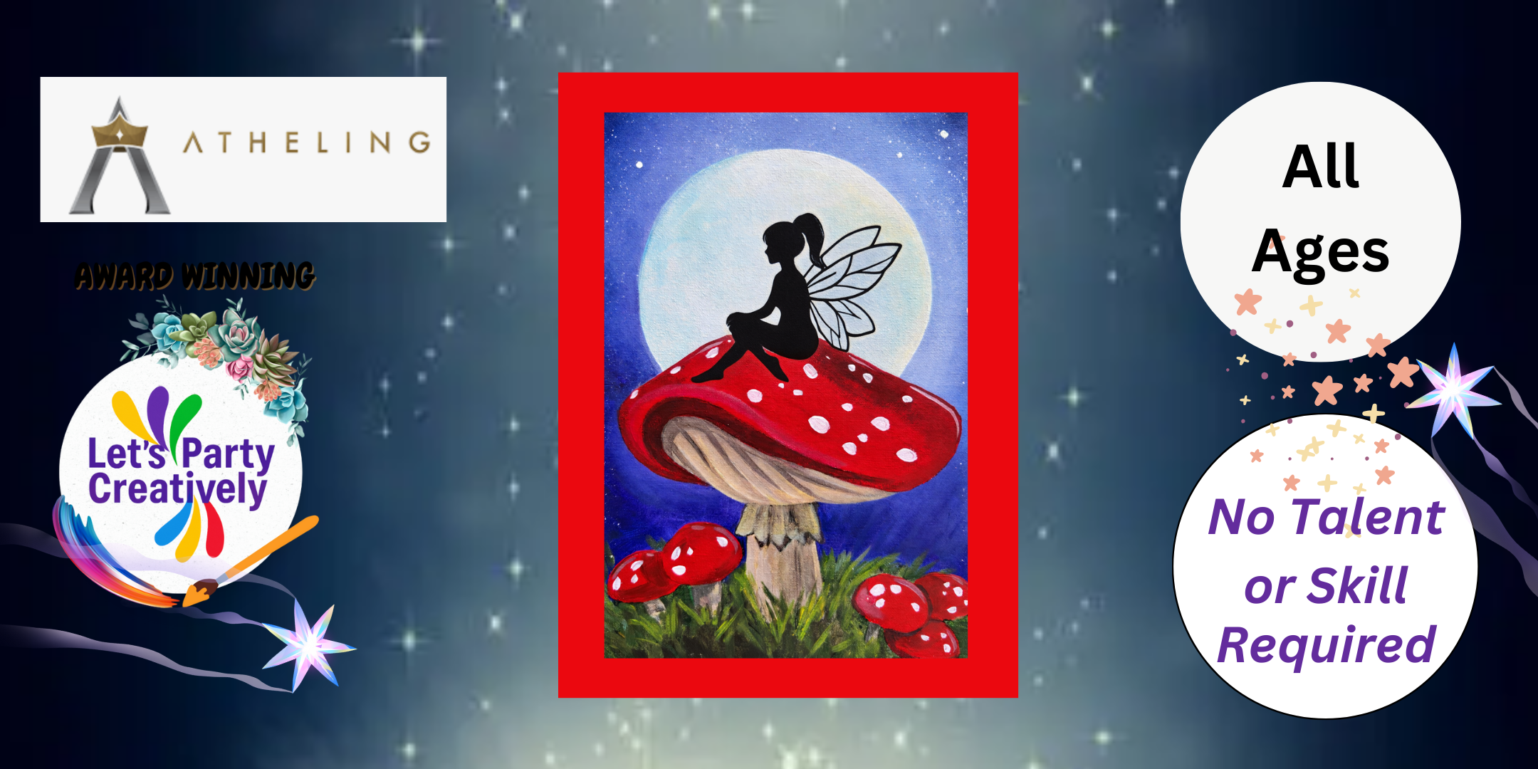 Step into a little magic and join Let’s Party Creatively for a whimsical, all-ages paint party at Atheling Meadeworks in Downtown Roanoke! This guided, step-by-step experience makes it easy and fun for everyone to paint a charming fairy perched atop a glowing mushroom—no talent or experience required. All canvases will be "pre-traced."Your ticket includes $5 toward an alcoholic or non-alcoholic beverage, so sip on handcrafted mead or a refreshing non-alcoholic option while you paint and unwind. Come early to enjoy food and drinks before the event or stay after to continue dining and relaxing in Atheling’s cozy, welcoming space.- All supplies provided- Beginner-friendly & pre-traced options available- Fun for kids, teens, adults, families, friends, and date nights- Spots are limited—advance tickets are strongly recommended!Grab your seat, bring your imagination, and let’s party creatively together in the heart of Downtown Roanoke!