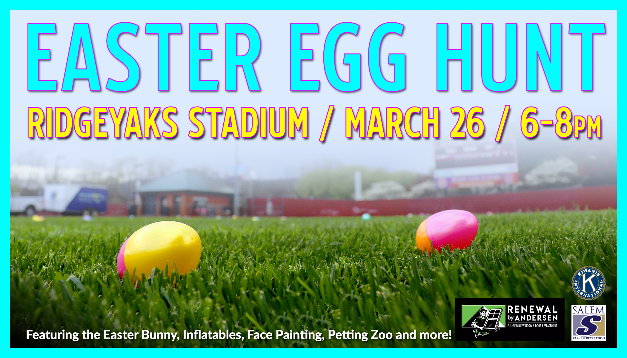 Calling all children ages 3 to 10 years old! Come to the Salem RidgeYaks Stadium for an Easter Egg Hunt and to visit with the Easter Bunny.Date: Thursday, March 26, 2026 Time: 6 - 8 pm. Egg Hunt Times: Hunts will be run approximately every 15 minutes with roughly 25 participants per hunt.Hunts for the 3&4 year old age group will be on the "Mini Fenway" field and the rest of the hunts will take place on the main baseball fieldCost: Free of charge Location: Salem RidgeYaks Stadium Concessions: Concessions will be available. Vendors: Crafts Creative Expressions Face Painting Easter Bunny Inflatables Little Critters Petting Zoo Balloon Animals Whimsical Wishes Characters MousePros Travel Agency Sponsored by: Renewal by Andersen and Salem Kiwanis Club