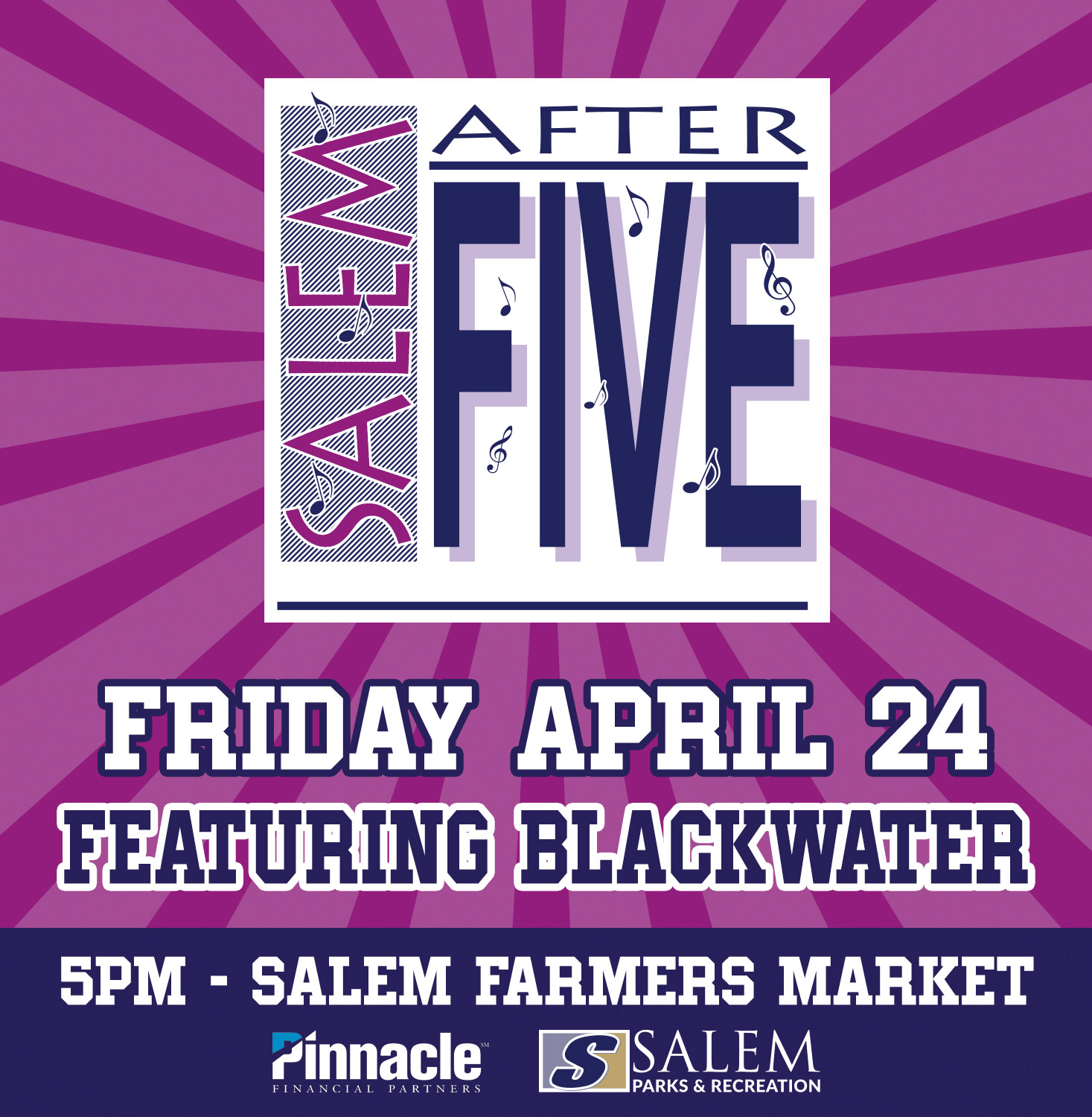 Come listen to live music and dance the night away! Bring a chair and blanket while enjoying food from local vendors and brews sold by P.A. Short. There are plenty of activities for children, as well. Time: 5:00 p.m. - 9:00 p.m. Location: Salem Farmers Market Cost: $5 (children under the age of 12 are FREE) Coolers, outside food, drinks, rollerblades, skateboards, and pets are not allowed on the premises. *NO RE-ENTRY* Friday, April 24: Blackwater Charity: Salem/Roanoke County Food Pantry Food Trucks: Dale's Diner Express, Cabo Fish Taco, Sweet Surrender Ice Cream, Kettle Cooker Express, Star City Sips Sponsored by: Pinnacle Financial Partners