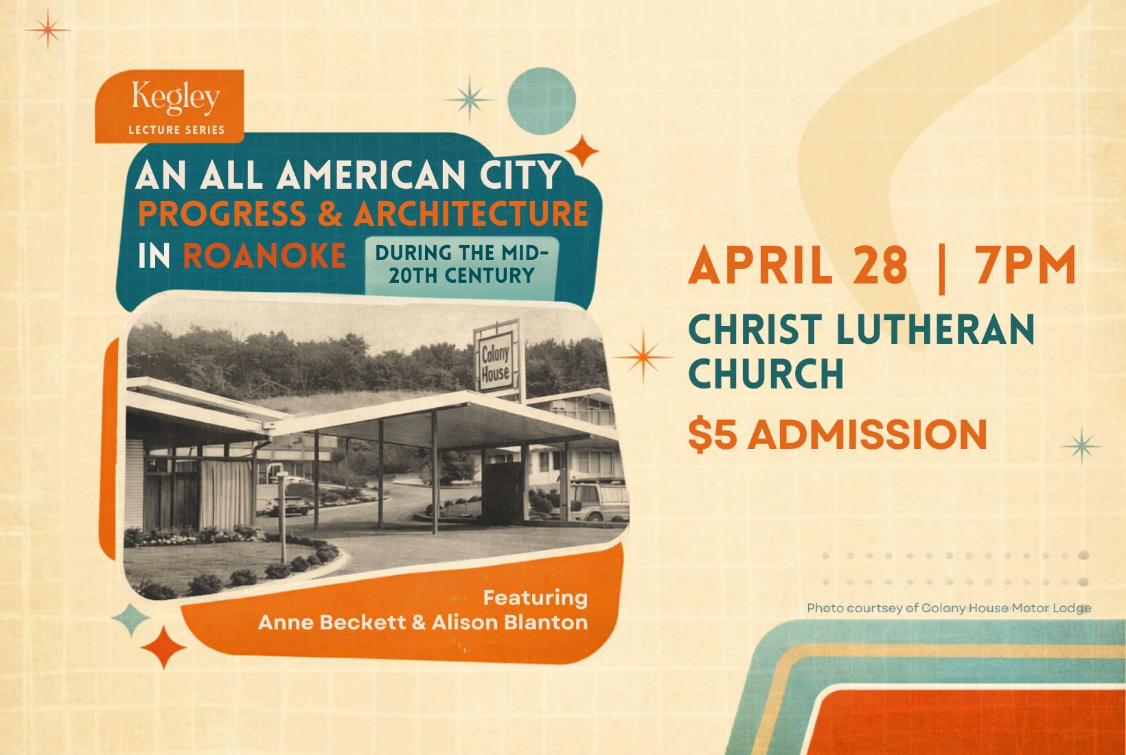 Join as in April as architectural historians, Anne Beckett and Alison Blanton, return to the Kegley Lecture Series with a talk on mid-century Roanoke. Beckett and Blanton will present an overview of the mid-20th Century economic conditions (the boom before the bust) and their influence on Roanoke’s architecture. The talk will look at the remaining Mid-Century Modern buildings and signage (including some before and after photos) from Williamson Road to downtown Roanoke to Salem, as well as discuss certain architects such as Kinsey, Motley, and Shane Architects & Engineers and the recent award-winning restoration of their signature structure, the Colony House Motor Lodge on Franklin Road. Gain a new perspective on the Roanoke landscape and uncover the hidden architectural treasures that exist amid the area's development, appreciating the unique qualities of Mid-Century Modern architecture, which is often overlooked or misunderstood. Kegley Lecture: "An All American City: Progress and Architecture in Roanoke During the Mid-20th Century" Tuesday, April 28 at 7pmChrist Lutheran Church$5 admission (free for HSWV members)