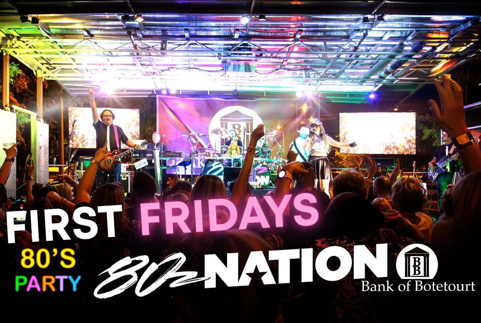 Event by First Fridays at Five, Inc. in Downtown Roanoke VA! Net proceeds benefit area non-profits. The Band:Heading our way from NC, 80z Nation will blow you away with their iconic renditions of e-v-e-r-y-t-h-i-n-g 80's! Break out your neon colors, Aqua net hairspray and head to Downtown Roanoke to be part of an incredibly FUN event! 80z Nation is an authentic cover band that does one thing – delivers a high energy, professional show to people who, like us, are stuck in the 80's! Best dressed contest with prizes! Check out details in our Facebook event! Gates open at 5:00PM. Tickets are purchased at the gate. Must be 21 or older to attend. No re-entry. Food:We have delicious food for sale from Mountain Grille Food Truck. They offer a great menu in addition to non-alcoholic beverages.https://www.facebook.com/usandmgOutside food and beverages are NOT permitted. Event Parking Instructions:Please park at the Williamson Parking Deck (free after 5:00pm) or anywhere in Downtown Roanoke that is convenient. We're a quick walk from the Downtown area to Franklin Road where all events are held. Seating:Please bring your own chair, all bags are subject to search. The Good Stuff:Beer, sangria, club cocktails, cider and vodka seltzers available for purchase. Our featured craft brewer rotates per event. We have domestic favorites as well. Stay tuned for more information on the featured craft brewer as the event gets closer.https://www.facebook.com/pashortdist Please No:weapons | coolers or outside containers | outside food or beverage | tents or umbrellas | pets | backpacks | All bags subject to search