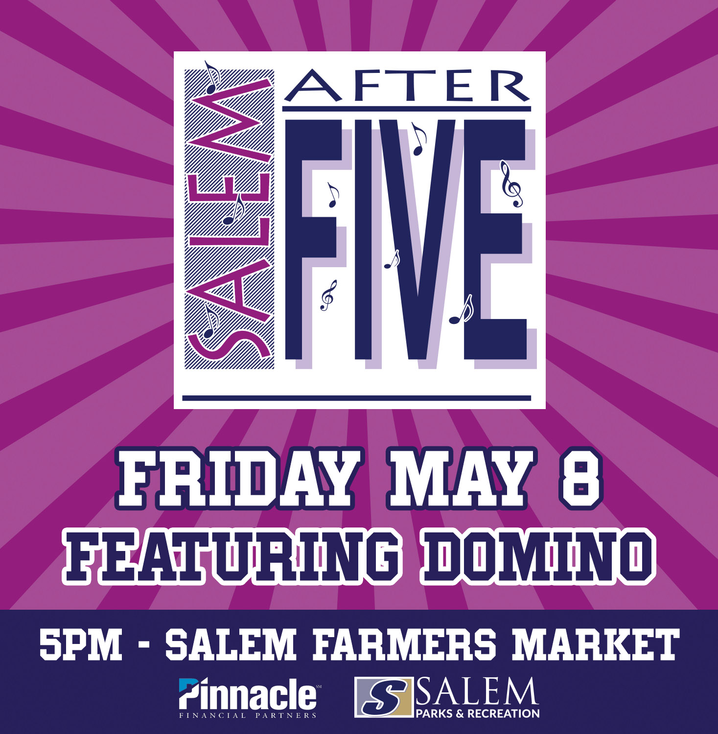 Join us for an evening of live music, great food, and community fun! Bring a chair or blanket and relax while enjoying local food vendors, cold brews from P.A. Short, and activities for all ages. Band: DominoDate: Friday, May 8Time: 5:00 p.m. – 9:00 p.m.Location: Salem Farmers MarketCost: $5 admission (children 12 & under are free) Charity Partner: Salem Kiwanis ClubFood Trucks: Star City Bodega, Sweet Surrender Ice Cream, Kettle Cooker Express, Star City SipsPresented by: Pinnacle Financial Partners No coolers, outside food or drinks, rollerblades, skateboards, or pets are allowed on the premises.No re-entry permitted.