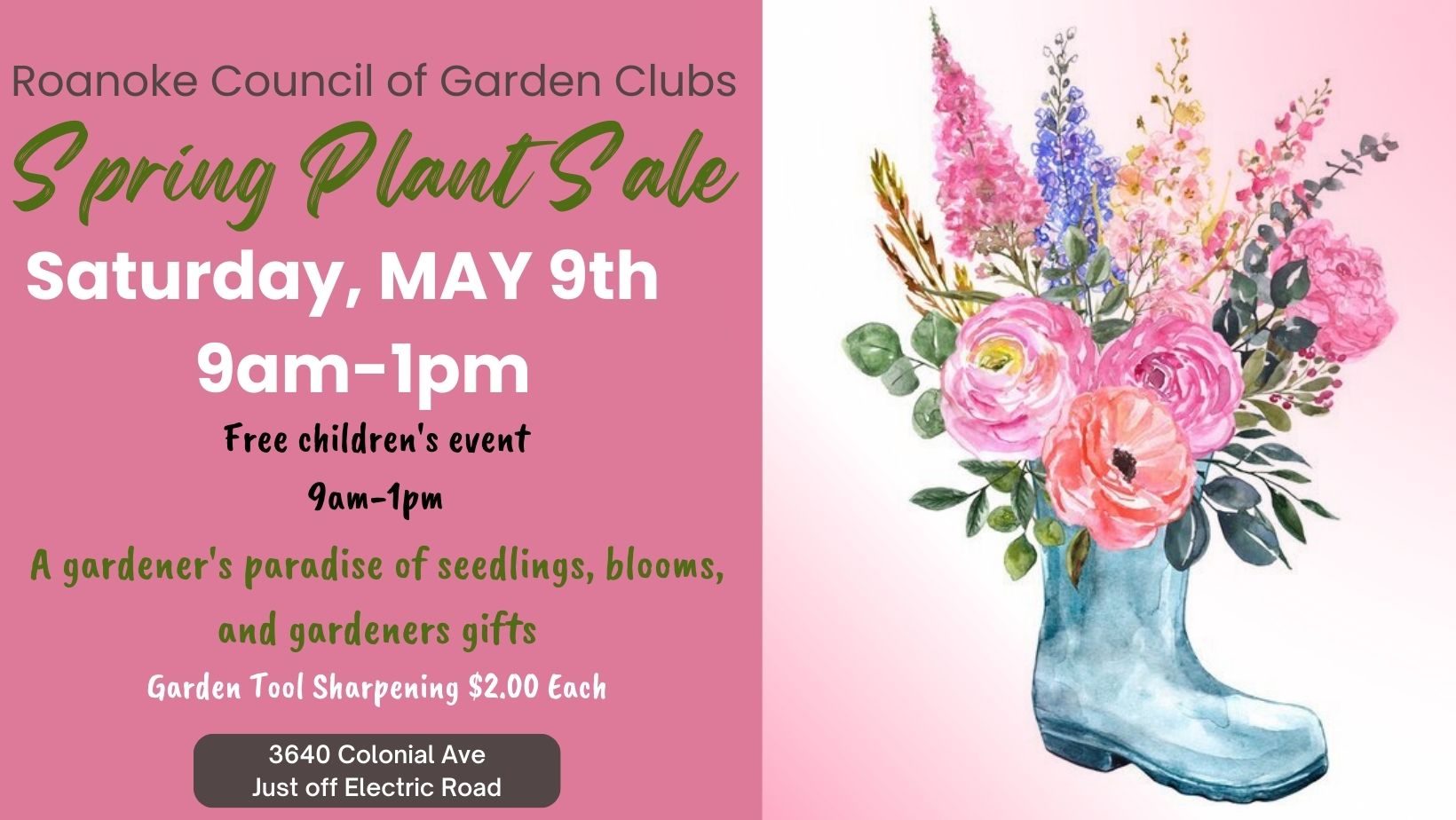 Spring Plant Sale presented by Roanoke Council of Garden Clubs. Don't miss this annual sale! Wonderful day to spend time with Mom, Grandma or anyone special in your life to purchase your favorite plants, flowers herbs and gifts.Roanoke Council of Garden Clubs annual Spring Plant Sale happening on May 9th 9am-1pm FREE Kid's Event and Tool Sharpening for only $2.00 per item.This year we are excited to welcome back some amazing vendors and adding a few new ones! We will be highlighting each one in the coming weeks, so you can plan on what you want to buy.