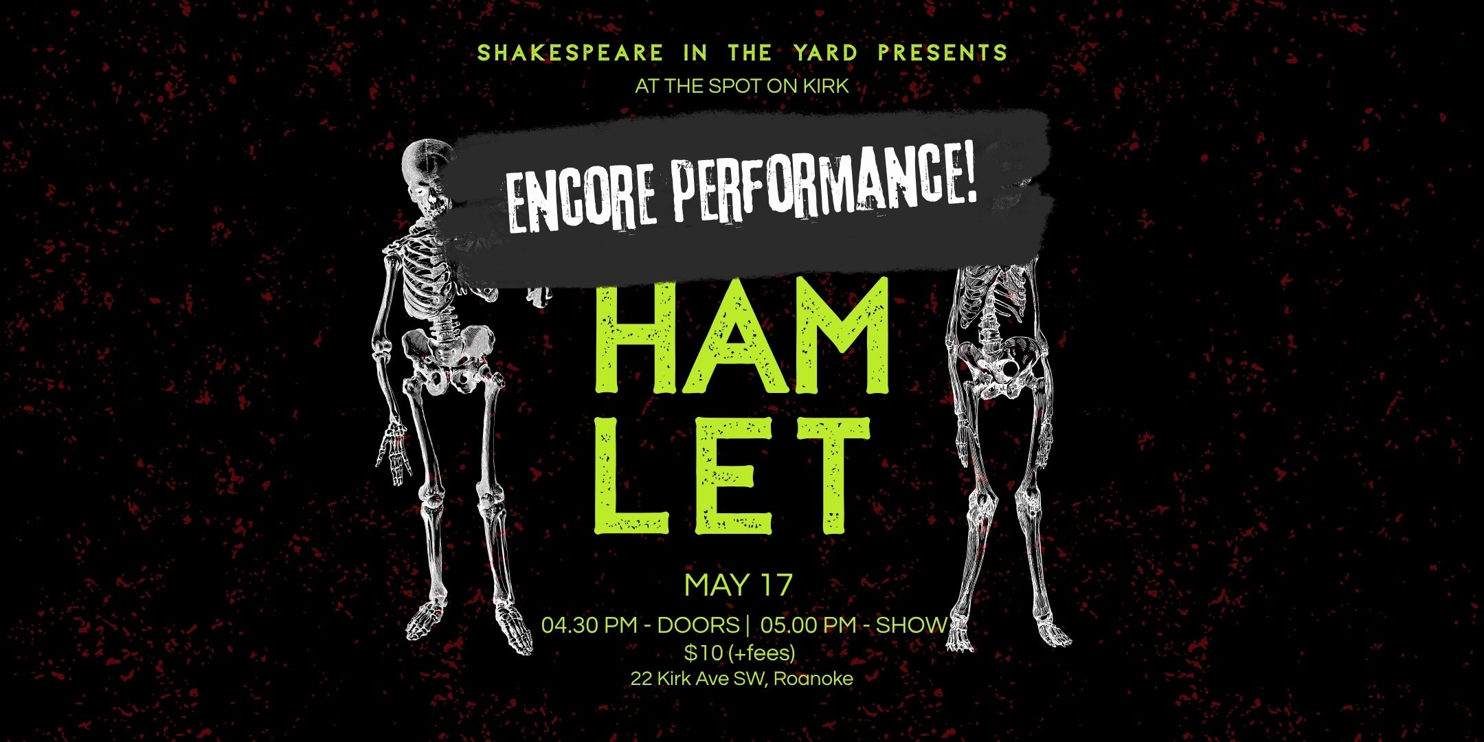 Shakespeare in the Yard presents: HAMLET - ENCORE PERFORMANCE - Sunday, May 16th - Doors 4:30pm | Starts 5:00pm The first two nights sold out so we squeezed in this third and final performance for you, so DON'T MISS IT! A frigid wind, an unexpected transition of power, and an eerie oath sworn in the night begin a rendition of this classic tragedy, shockingly at home in the present day. Explore the struggles of control, love, manipulation, and loss as the residents and visitors of Elsinore strive...