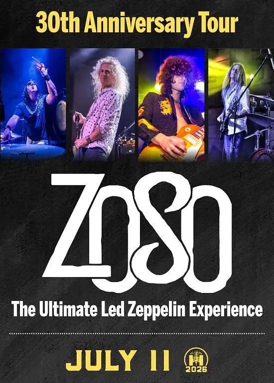 Rescheduled from 12/20/25, due to a medical situation within the band, we are proud to announce the new date of July 11th, 2026. Tickets purchased for the Dec.20th show are good for the rescheduled show, but if you can't make the new day you have until Feb.3rd to request a refund. Zoso: The Ultimate Led Zeppelin Experience Celebrating their 30th anniversary in 2025, Zoso has become one of the most iconic and respected Led Zeppelin tribute experiences in the world, having played over 4,800 shows across the globe. Known for their unparalleled dedication to faithfully recreating the legendary band's live performances, Zoso has earned accolades from both critics and fans alike.The band was founded by Matt Jernigan and Adam Sandling, both of whom are renowned for their exceptional musicianship and passion for Led Zeppelin's music. Jernigan, who takes on the colossal role of Robert Plant, has a commanding stage presence that rivals the icon himself. Sandling, who brings John Paul Jones to life, masterfully plays bass, keyboards, and mandolin, replicating the multifaceted talent of the Zeppelin legend.In 2015, Bevan Davies joined Zoso as John Bonham, completing the lineup. An accomplished drummer with a resume that includes playing with Danzig, Jerry Cantrell (of Alice in Chains), Static X, and Billy Duffy (of The Cult), Davies brings an unmistakable power and precision to Zoso’s live shows, helping the band recreate Bonham’s legendary drum sound.Zoso’s live performances focus on the raw energy and intricate musicality of Led Zeppelin’s best-known hits and deeper tracks, with a particular emphasis on recreating their live show experience. The band’s commitment to authenticity has earned them praise from major outlets, with the LA Times calling them “head and shoulders above all other Led Zeppelin tributes,” and the St. Petersburg Times describing them as “the most exacting of all the Led Zeppelin tributes.”With over 30 years of music history behind them, Zoso continues to be regarded as one of the finest Led Zeppelin tributes, with the Chicago Sun-Times calling them “the closest to the original of any Led Zeppelin tribute.” Whether you're a lifelong fan of Led Zeppelin or discovering their music for the first time, Zoso delivers an unforgettable experience that takes you back to the glory days of rock and roll.
