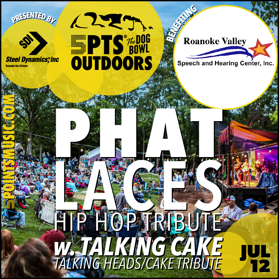 5PTS Outdoors @ The Dog Bowl is excited to rollout a new community benefit series, 5PTS Legendary Brunch, to raise money for local non-profits. Held on Sundays from 11am-4pm, this event features live music, vendors, kids activities, food trucks, and brunch courtesy of Donnie D's Bagels! In July, we are partnering with Roanoke Valley Speech and Hearing Center and music from Hip-Hop tribute, Phat Laces w. Talking Cake covering songs from Talking Heads and Cake. For over 60 years, The Roanoke Valley Speech and Hearing Center has been helping people of all ages develop their communication skills so they can better relate to the world around them.Inspired by their mutual love for rap and funk, Phat Laces was created. The vision was to form an instrument driven group that could convey the true feel of hip-hop. The band melds incredible musicianship with dope rhymes, stellar singing, and savory solos. The Laces take you on a ride through the 50 years of hip-hop. Slaying the stylings of The Sugar Hill Gang, Outkast, Biggie, Mac Miller, and much more, they are Mos Def going to get your Body Movin’!! Pop and lock your way down, and shake your groove thang with Phat Laces.Talking Cake is a vibrant 7-piece music band based in Roanoke, VA, bringing the energetic sounds of Cake the band and Talking Heads to life. Our unique blend of musical styles in our live performances creates an unforgettable experience for audiences of all ages.Kids 12 & under are FREE!FIND OUT MORE ABOUT 5PTS OUTDOORS @ THE DOG BOWLThis series would not be possible without our generous sponsors and supporters like you! Thank you for supporting our mission and bringing this super fun series to our community.Lots of love to our Top Dog Sponsor Steel Dynamics!So grateful for our longtime partner and Puppy Dog Sponsor L. O'ppleman.Thank you to our Snoop Dog Sponsors: NSR Realty Team and Williams DeLoatche, P.C.Much love to our Dog Lover Sponsors AO Smith, Alkeme Insurance, Herc Rentals, James River Equipment, Lauris Online, Parker Design Group, Renewal By Andersen of Central VA & Roanoke, Room For Improvement, Small Batch Liquidations, Town Center Tap House.Gratitude goes out to our Dog Whisperer Sponsors: Cushman & Wakefield | Thalhimer, Dominion Risk Advisors, Glofiber Business, Lionberger Construction, Marsh McLennan Agency, Roanoke Fruit & Produce, TIDY Services, and VRC Properties.Much love to our In-Kind Sponsors: Black Dog Salvage,Brown Hound Tree Service/Slab Slayers, Clean Valley Council, Location Services Group, Salem Cycle Center, Salem Printing, Scratch Biscuit Company, Trail Taps, Treble Makers Music.5 Points Music Foundation is recognized 501c3 whose mission is to pursue the power of sound through live events that support access to music therapy, hearing loss advocacy, and accessibility initiatives. Read our story at 5pointsmusic.com.